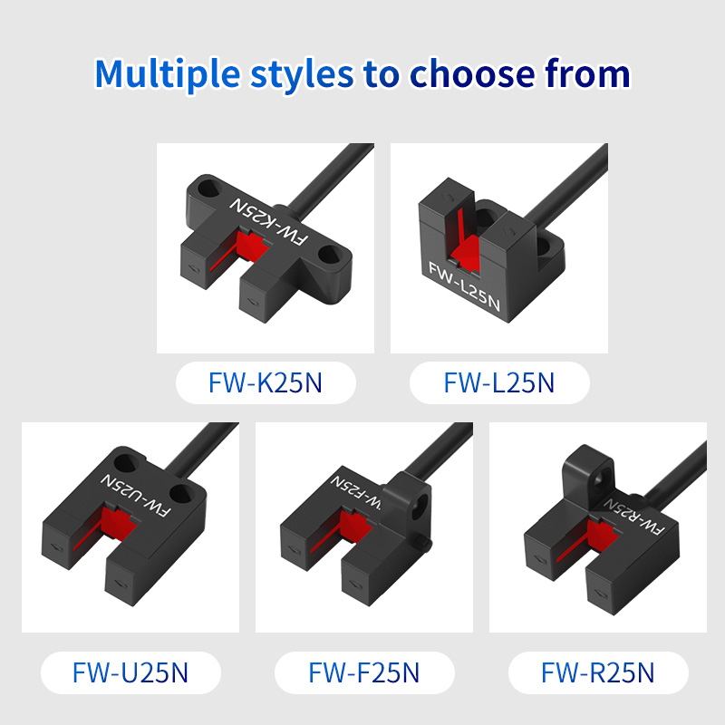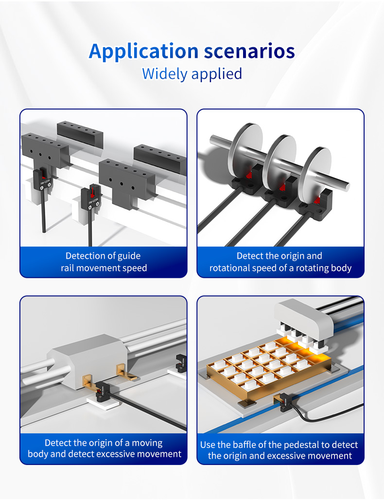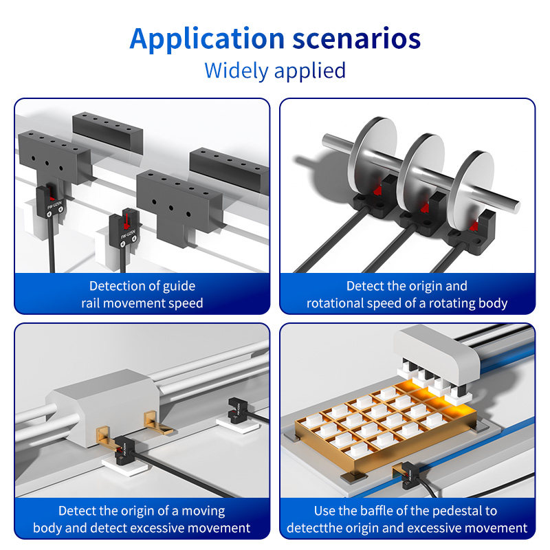 Az FW25 U-horony érzékelő sokoldalúsága miatt számos iparágban, többek között a csomagolásban, az anyagkezelésben, a CNC megmunkálásban és az összeszerelés automatizálásában használható alkatrész. A vezetősín mozgási sebességének észlelése: Lineáris mozgási rendszerekben a mozgó kocsira szerelt zászló áthaladhat az U-horonyba. Az impulzusok időbeli számlálásával az FW25 pontosan ki tudja számítani a vezetősín lineáris sebességét, lehetővé téve a sebesség megfigyelését és szabályozását. Mozgó test eredetének és túlfutásának észlelése: Az érzékelő tökéletesen alkalmas az irányadó szekvenciákhoz. Egy lineáris aktuátoron vagy robotkaron lévő fül halad át a hornyon, pontos „otthon” vagy „eredet” jelet adva a vezérlőnek. Ezenkívül egy második érzékelő is elhelyezhető az út végén a túlfutás észlelésére, megelőzve a mechanikai sérüléseket és biztosítva a működés biztonságát.A forgó test eredetének és forgási sebességének észlelése: Egyetlen fület vagy többfogú kereket szereljen fel egy forgó tengelyre. Amikor minden fül áthalad az 5 mm-es hornyon, az FW25 impulzust generál. Fordulatonként egyetlen impulzus biztosítja az eredetadatokat, míg a több impulzus pontos forgási sebesség-számítást (RPM) tesz lehetővé, ami elengedhetetlen a motorvezérléshez és a folyamatfelügyelethez. Használja a rögzítőkonzol terelőlemezekkel a pozicionáláshoz: Sok rendszer egyszerű, rögzített terelőket használ. Az FW25 párosítható tartókonzoljával vagy egyedi lámpatestekkel, hogy észlelje ezeknek a terelőlemezeknek a jelenlétét vagy helyzetét, egyszerű és költséghatékony végálláskapcsoló rendszert hozva létre.