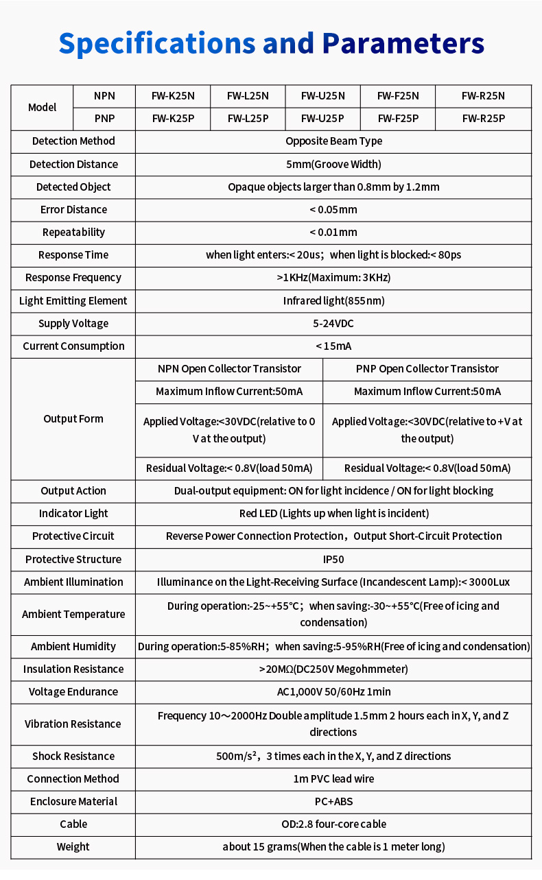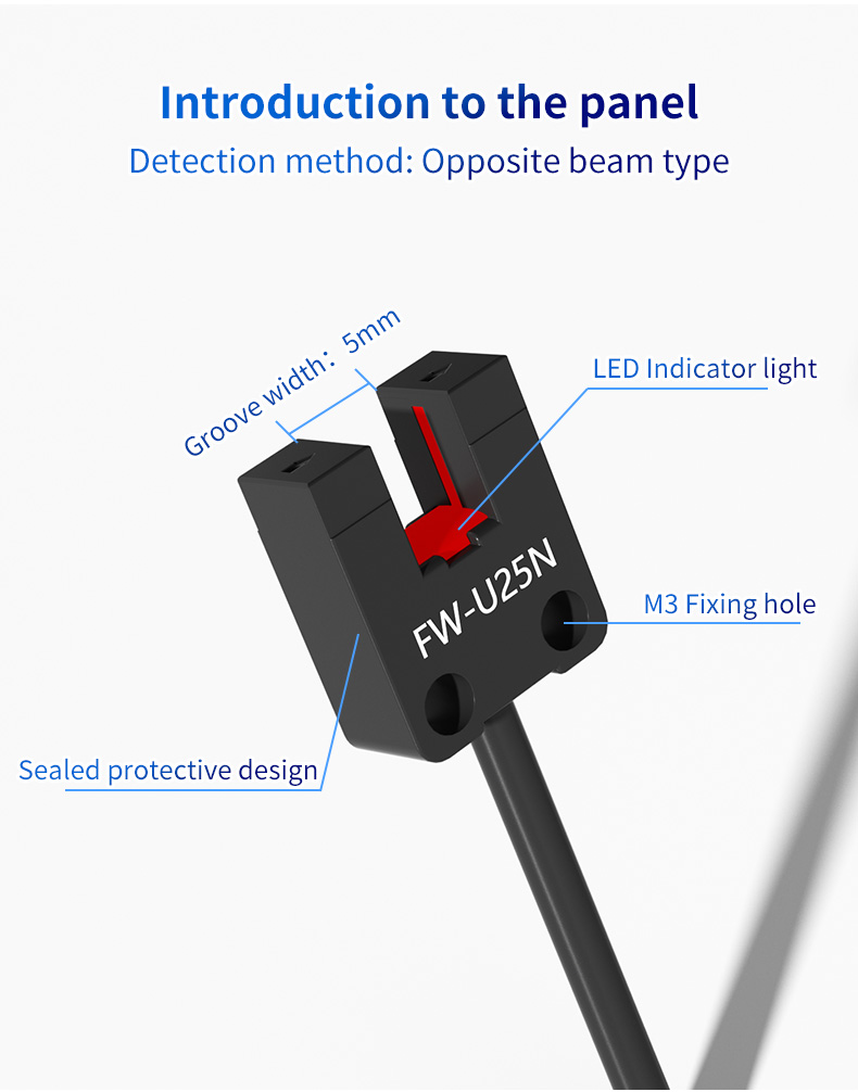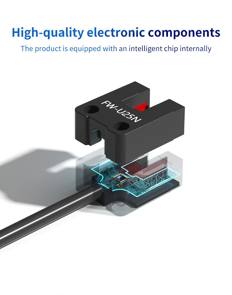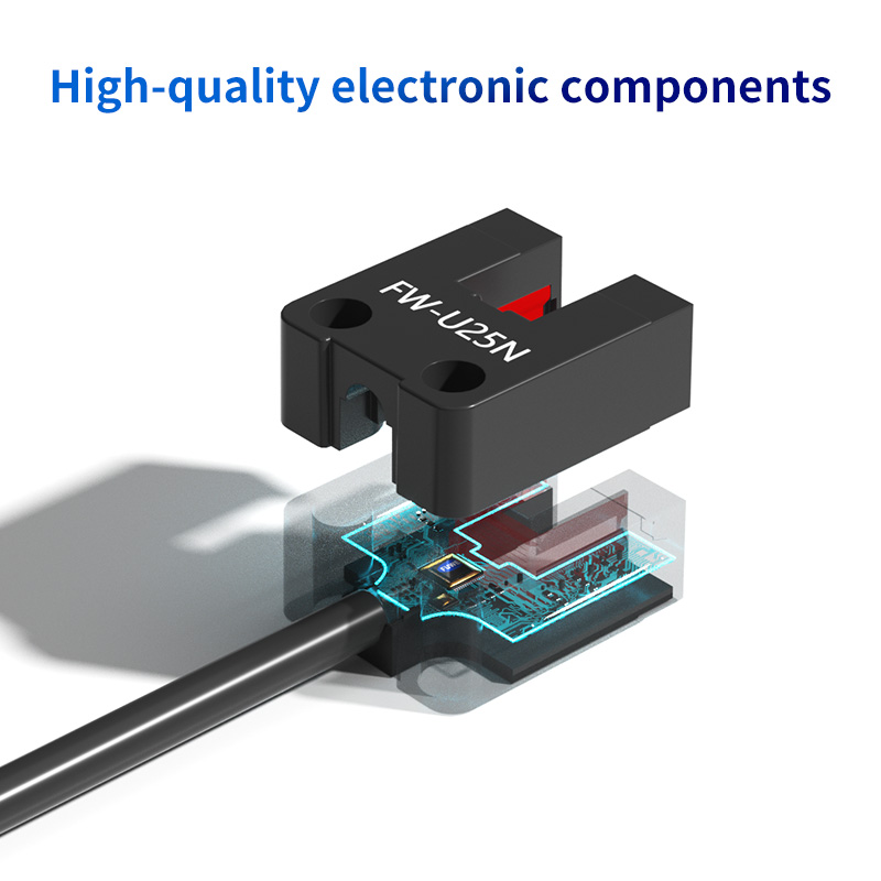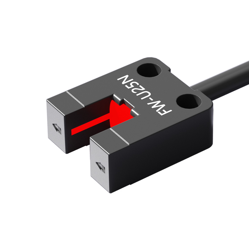 Az FW25 sorozat magja a pontosan megtervezett 5 mm-es horonyszélesség. Ez a kompakt, de hatékony kialakítás lehetővé teszi a nagyon kicsi tárgyak, vékony zászlók vagy a nyíláson áthaladó működtetőfülek észlelését. A barázdán belüli átmenő sugár érzékelési elve biztosítja a környezeti fénnyel szembeni magas védettséget és a felületi visszaverődést, stabil és megbízható jelet biztosítva még kihívásokkal teli körülmények között is. Ez tökéletessé teszi a pontos helyzetpontosságot igénylő alkalmazásokhoz, mint például az origó-érzékelés lineáris vezetőkben vagy a fogak számlálása kis fogaskeréken.