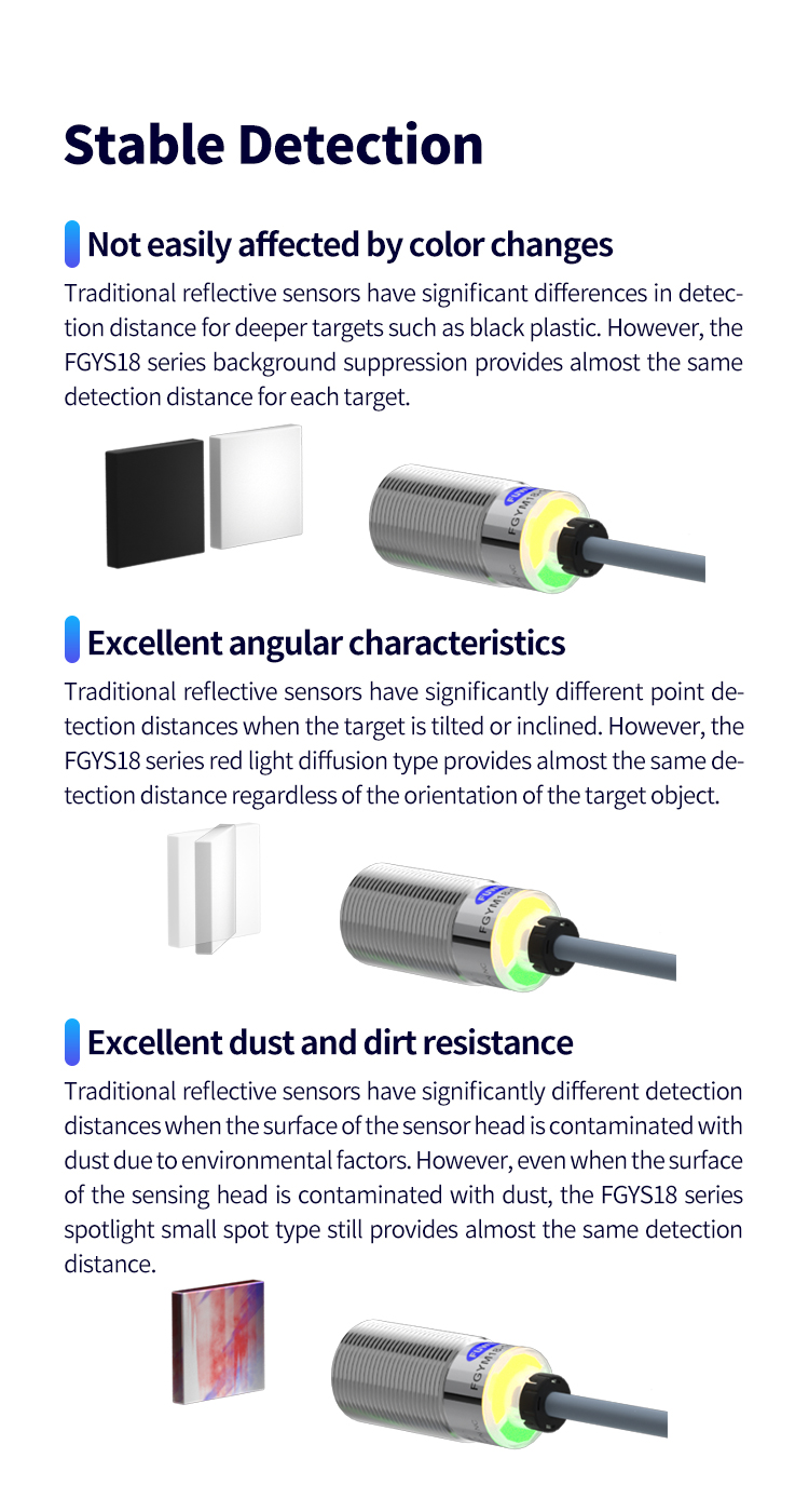 A hagyományos érzékelők gyakran nem észlelik a tárgyakat a szín vagy az anyag variációi miatt. Az FGY18-10NU-B fejlett optikai kialakítást alkalmaz a tárgyak stabil észlelése érdekében, színtől vagy anyagtól függetlenül. Függetlenül attól, hogy fém alkatrészeket, műanyag munkadarabokat vagy sötét színű anyagokat észlel a CNC megmunkálása során, fenntartja a következetes érzékenységet, biztosítva a zökkenőmentes és pontos gyártási folyamatokat.