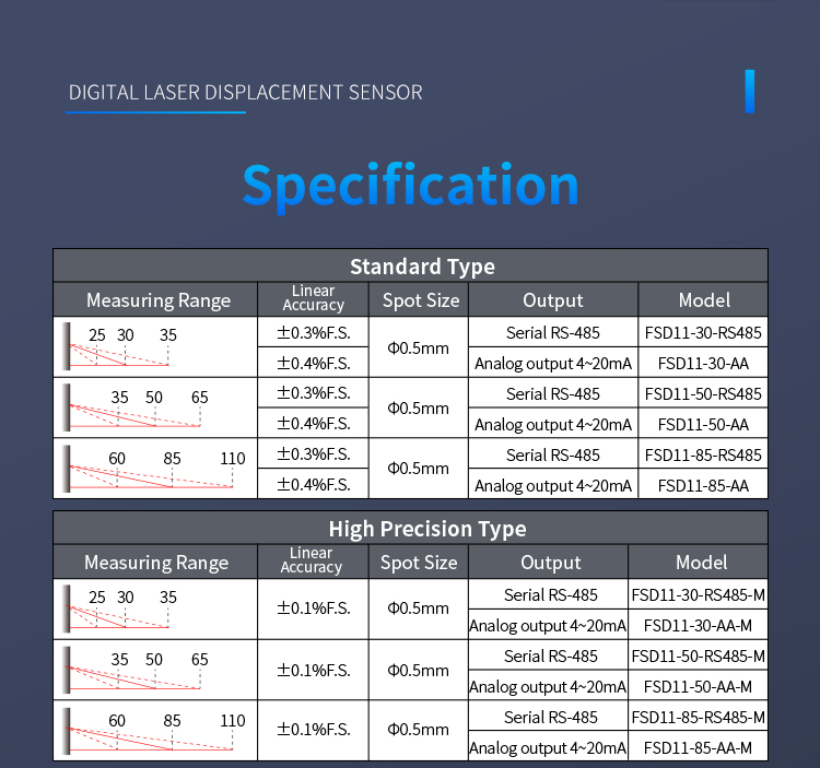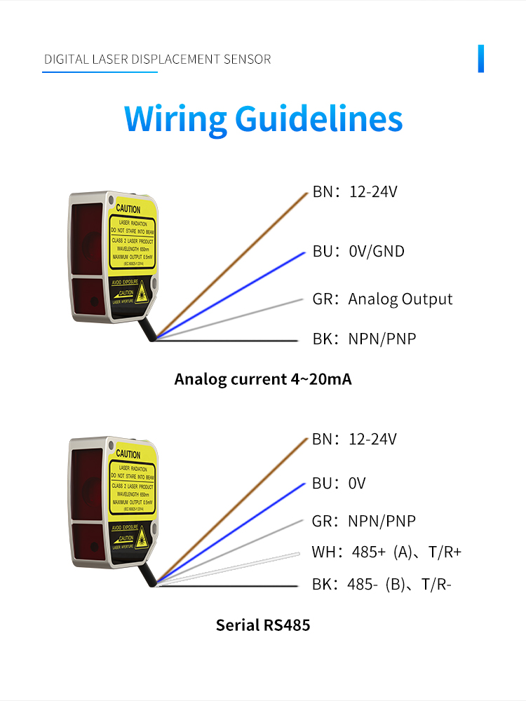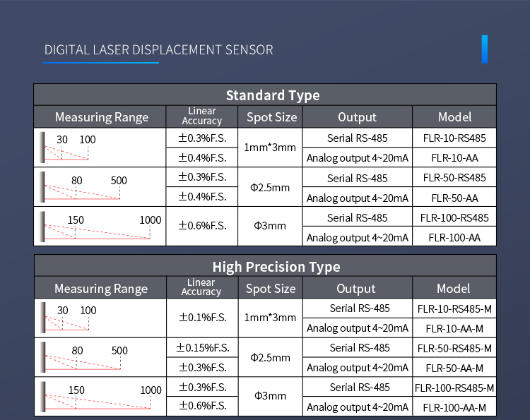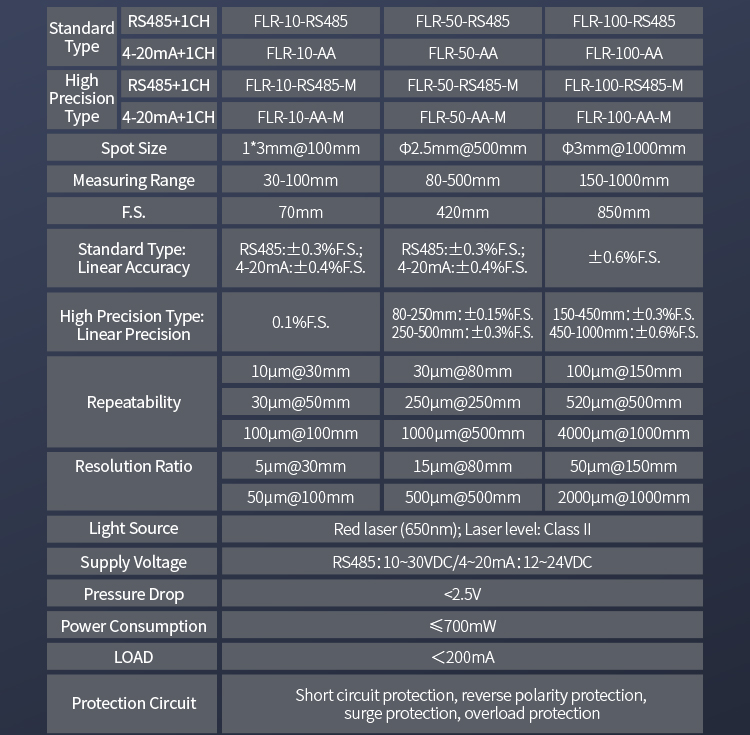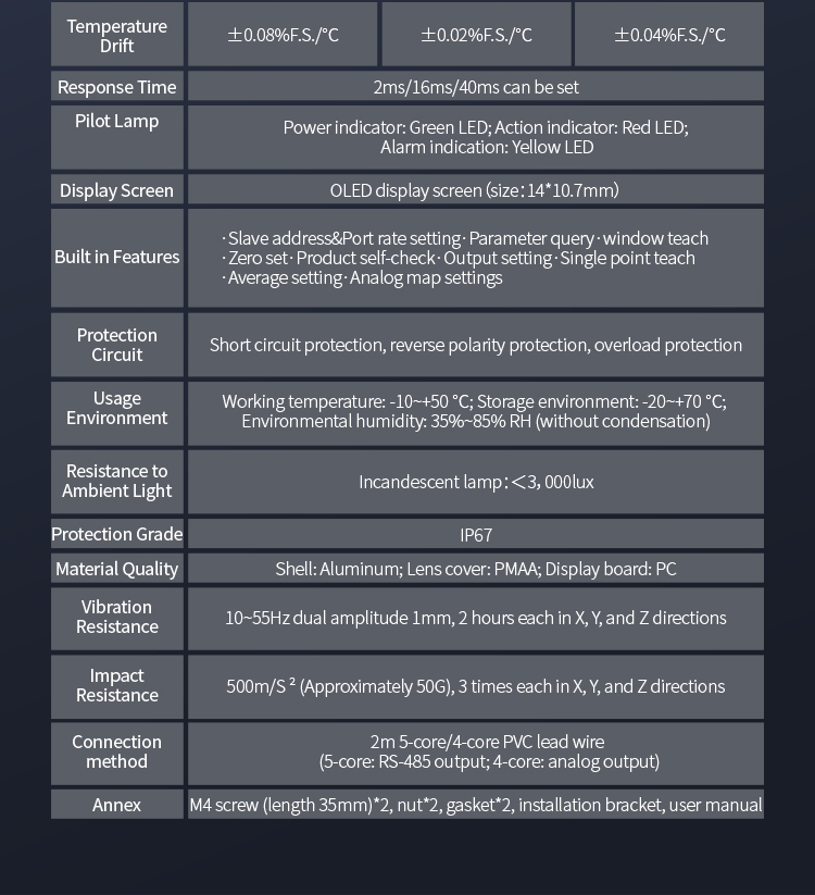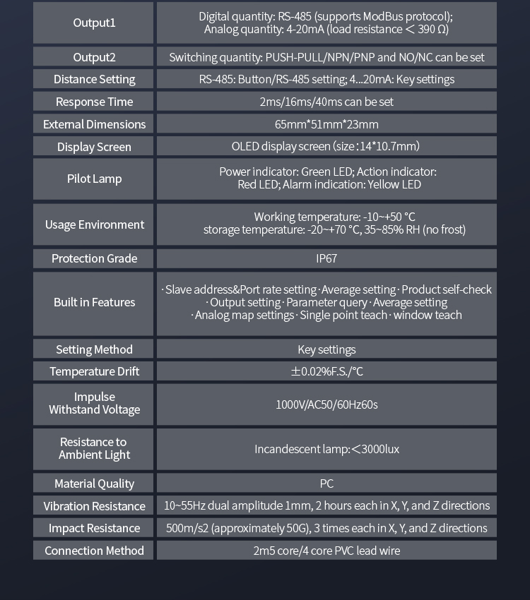 A kétgombos beállítás lehetővé teszi a 10-850 mm-es tartomány rugalmas kiválasztását, kapcsolókimenettel és analóg áramkimenettel, valamint RS485 kommunikációs kimenettel, a különféle használati igényeknek megfelelően.