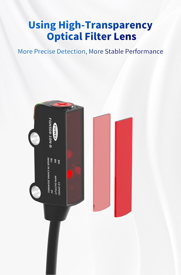 Komplex ipari környezetben a különféle fény- és elektromágneses interferenciák gyakran befolyásolják az érzékelők észlelését. Az FGNS08-08 sorozat speciális, nagy transzmissziós szűrő lencsét alkalmaz, amely hatékonyan szűri a környezeti fényt és az elektromágneses interferenciát, biztosítva, hogy az érzékelő csak érvényes detektálási jeleket fogadjon.