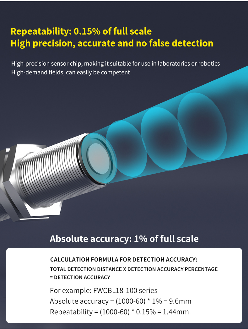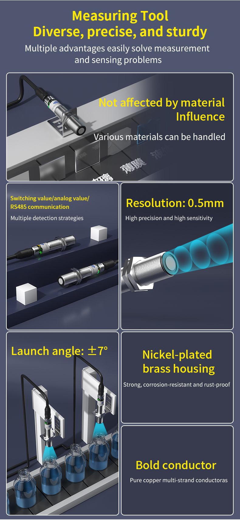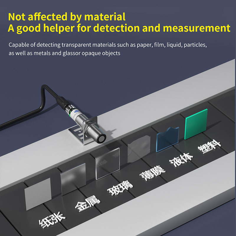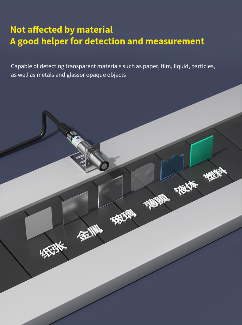 Nagy pontosságú, 0,5 mm-es felbontásának és szűk ±7°-os kibocsátási szögének köszönhetően rendkívüli mérési pontosságot és kiváló interferenciaállóságot biztosít. Függetlenül a célfelülettől – fényelnyelő, visszaverő vagy átlátszó – stabil teljesítményt nyújt, teljesen nem befolyásolja az észlelt tárgy anyaga vagy színe.