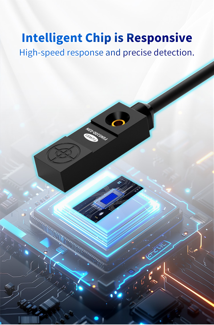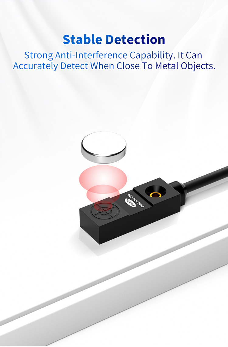 Íme egy egyszerű részlet az FSNS10D-03N működéséről: Generálás: Az érzékelő érzékelőfelülete egy tekercset tartalmaz, amely nagyfrekvenciás elektromágneses teret hoz létre. Zavar: Amikor egy fémtárgy (a cél) belép ebbe a mezőbe, "örvényáramok" képződnek a fém felületén. Észlelés: Ezt a zavart az elektromágneses mező pontosan érzékeli az érzékelőben. A chip ezután feldolgozza ezt a változást, és szilárdtest kimenőjelet indít el, jelezve az objektum észlelését. Ez az érintésmentes működési elv kulcsfontosságú az érzékelő hosszú élettartama és kivételes megbízhatósága szempontjából, mivel nincsenek elhasználódó mechanikai alkatrészek.