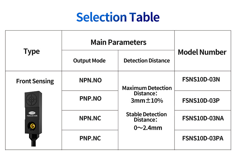 Mielőtt belemerülnénk a műszaki specifikációkba, tisztázzuk, hogy az FSNS10D-03N milyen alapvető értéket hoz a rendszere számára: „Nulla hiba” észlelés páratlan stabilitással: A stabil érzékelési képességekkel és erős interferencia-elhárító képességgel tervezett érzékelő megbízhatóan figyelmen kívül hagyja a környező fémrengeteget és az elektromos zajt. Ez közvetlenül lecsökkent leállást, jobb termékminőséget és alacsonyabb karbantartási költségeket jelent. Nagyobb sebesség elérése intelligens reakciókészséggel: Az integrált intelligens chip kivételesen gyors válaszsebességet biztosít, lehetővé téve a precíz észlelést a nagy sebességű automatizált folyamatokban. Ez lehetővé teszi a ciklusidő növelését és az áteresztőképesség maximalizálását a pontosság feláldozása nélkül.Tér és környezeti kihívások meghódítása: Kompakt kialakítása lehetővé teszi a könnyű telepítést különféle szűk telepítési munkaterületeken. Az IP67 víz- és porálló besorolással párosulva megbízhatóan működik olyan környezetben, ahol más érzékelők meghibásodnának, páratlan telepítési rugalmasságot és tartósságot kínálva. Egyszerűsítse az integrációt a Dual Sensing sokoldalúságával: Kategóriájában egyedülálló módon a két érzékelési mód lehetővé teszi, hogy az érzékelő viselkedését a konkrét telepítési körülményekhez igazítsa. Ez